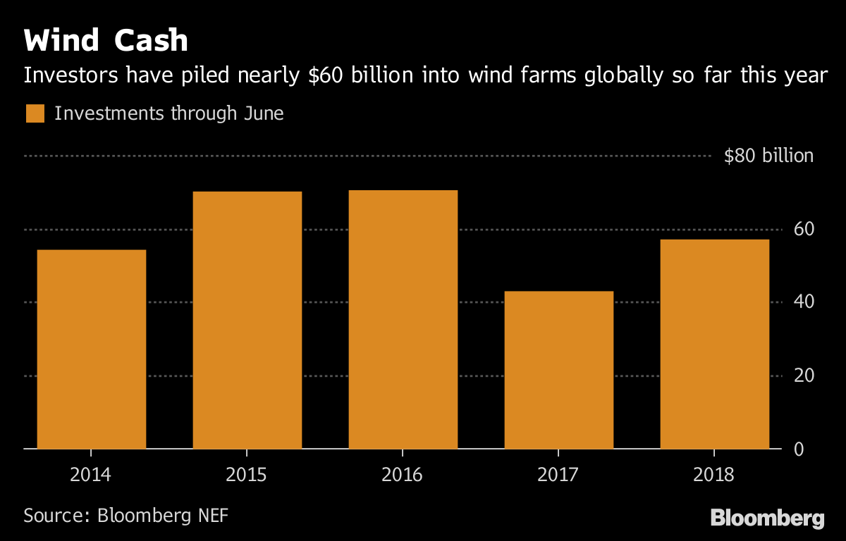 從地區(qū)來(lái)看,上半年,美國(guó)風(fēng)電投資飆升至175億美元,比2017年上半年翻了一倍多。這是因?yàn)殚_(kāi)發(fā)商正在努力爭(zhēng)取在2019年之后計(jì)劃結(jié)束的聯(lián)邦稅收抵免之前完成投資。